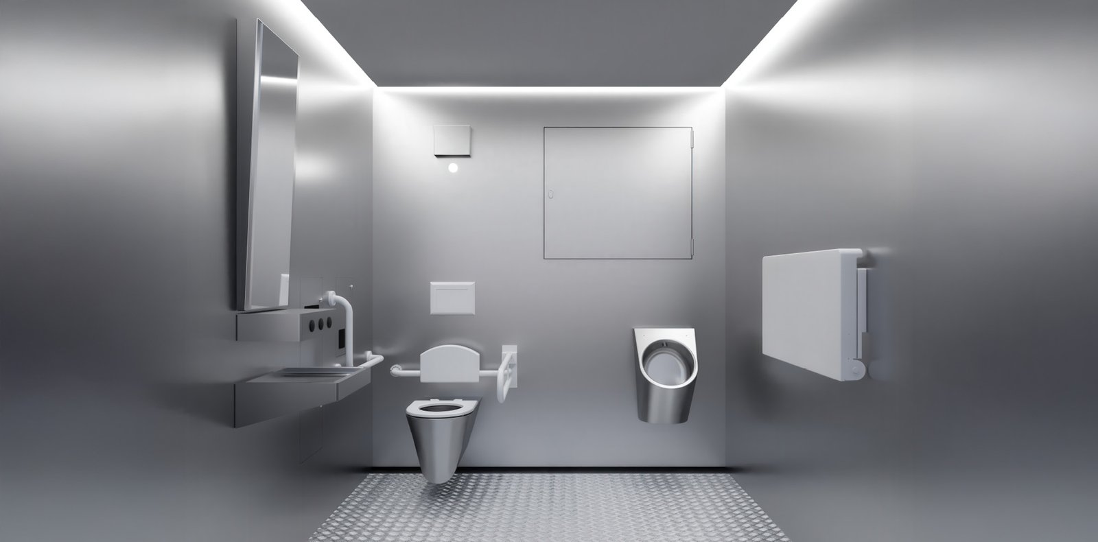 Der Waschtisch bietet auf knopfdruck Wasser, Seifenspender sowie Handtrockner – und dies vandalensicher.